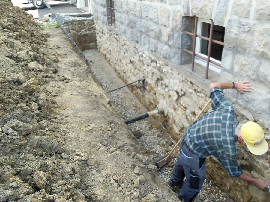 Bevor eine fachgerechte Abdichtung erfolgen kann, wird der betroffene Bereich zunächst durch präzise Erdarbeiten freigelegt. So ermöglichen wir den direkten Zugang zum Mauerwerk und können die Ursache der Feuchtigkeit gezielt behandeln.